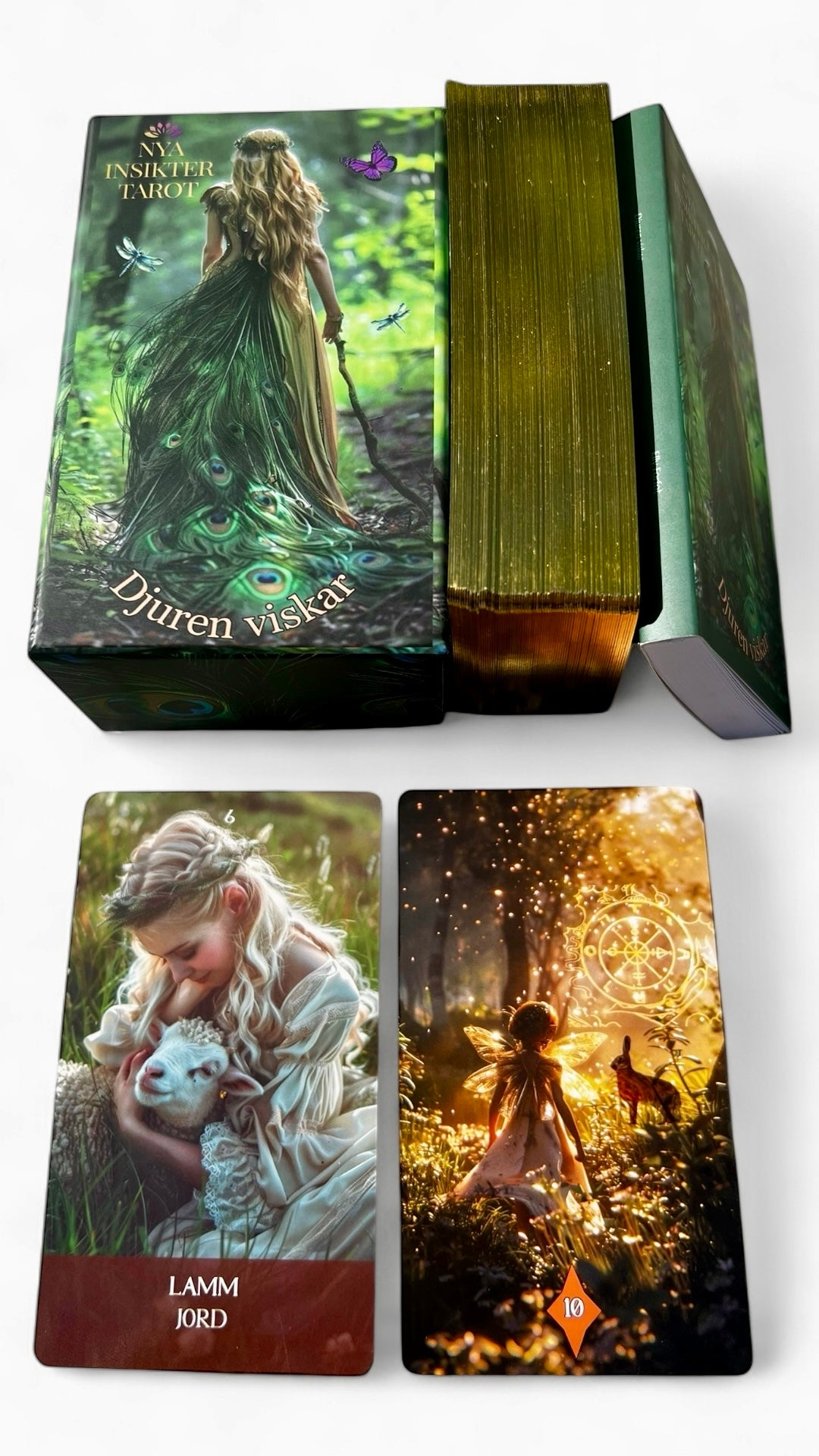 Djuren viskar är en vackert illustrerad guidebok med 78 bilder och texter som förenar tarotens traditionella struktur med djurens djupa och tidlösa symbolik. Den kan användas både för daglig inspiration och för andlig vägledning.